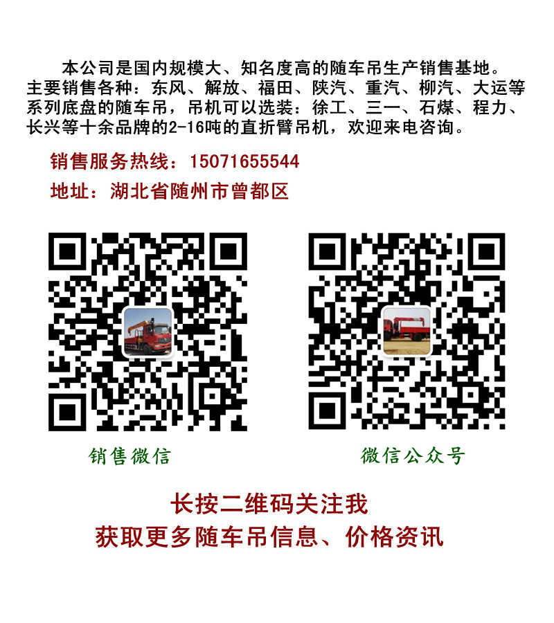 我公司專業(yè)銷售各種隨車吊 ,常年備有各種現(xiàn)車幾十輛,服務(wù)電話:15071655544(微信同號(hào))  周經(jīng)理。